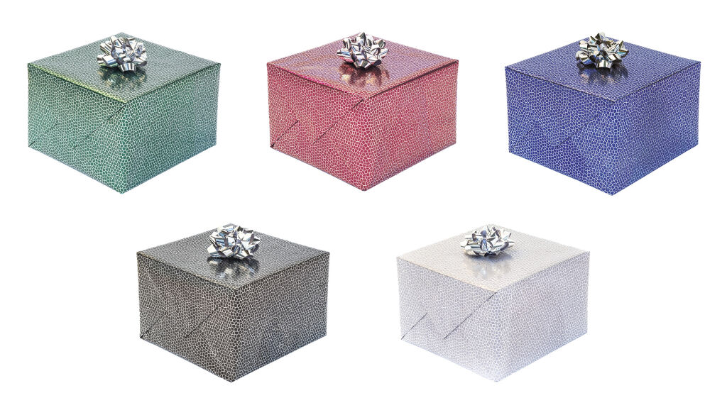 Celoroční dárkový balicí papír s metalickým potiskem.