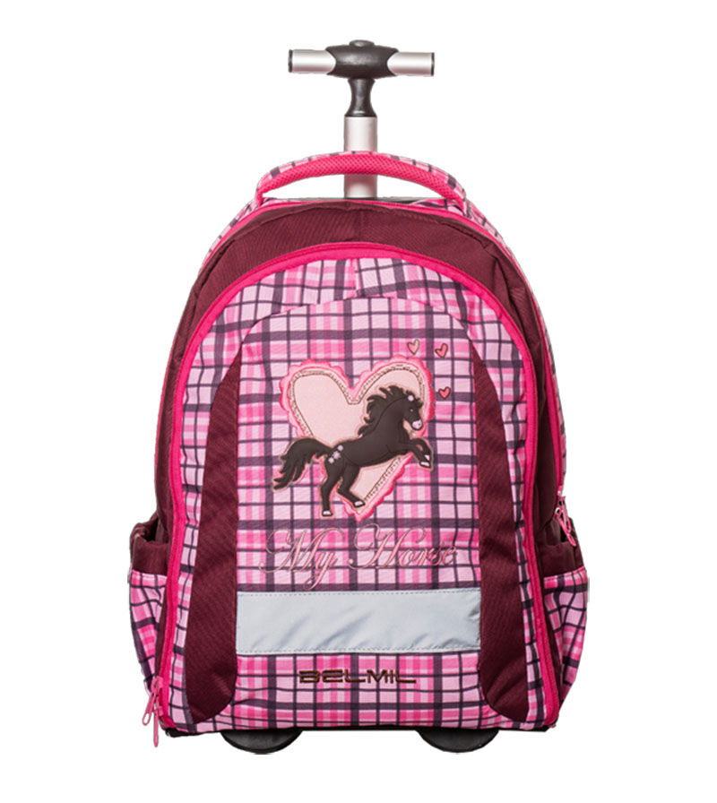 Školní batoh s kolečky (1900g) My Pretty Horse s mnoha funkčními prvky. Teleskopická rukojeť. Vyroben z vysoce kvalitního, pevného a nepromokavého materiálu. Zesílená konstrukce. Polstrované ramenní popruhy. Polstrovaná rukojeť. Reflexní prvky.