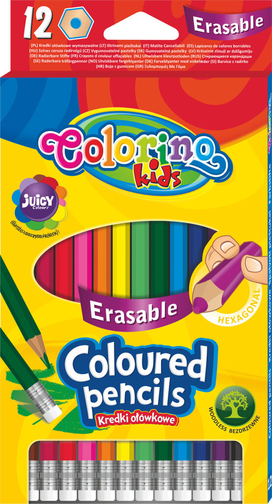 Hexagonální gumovatelné pastelky Colorino, 12 barev.