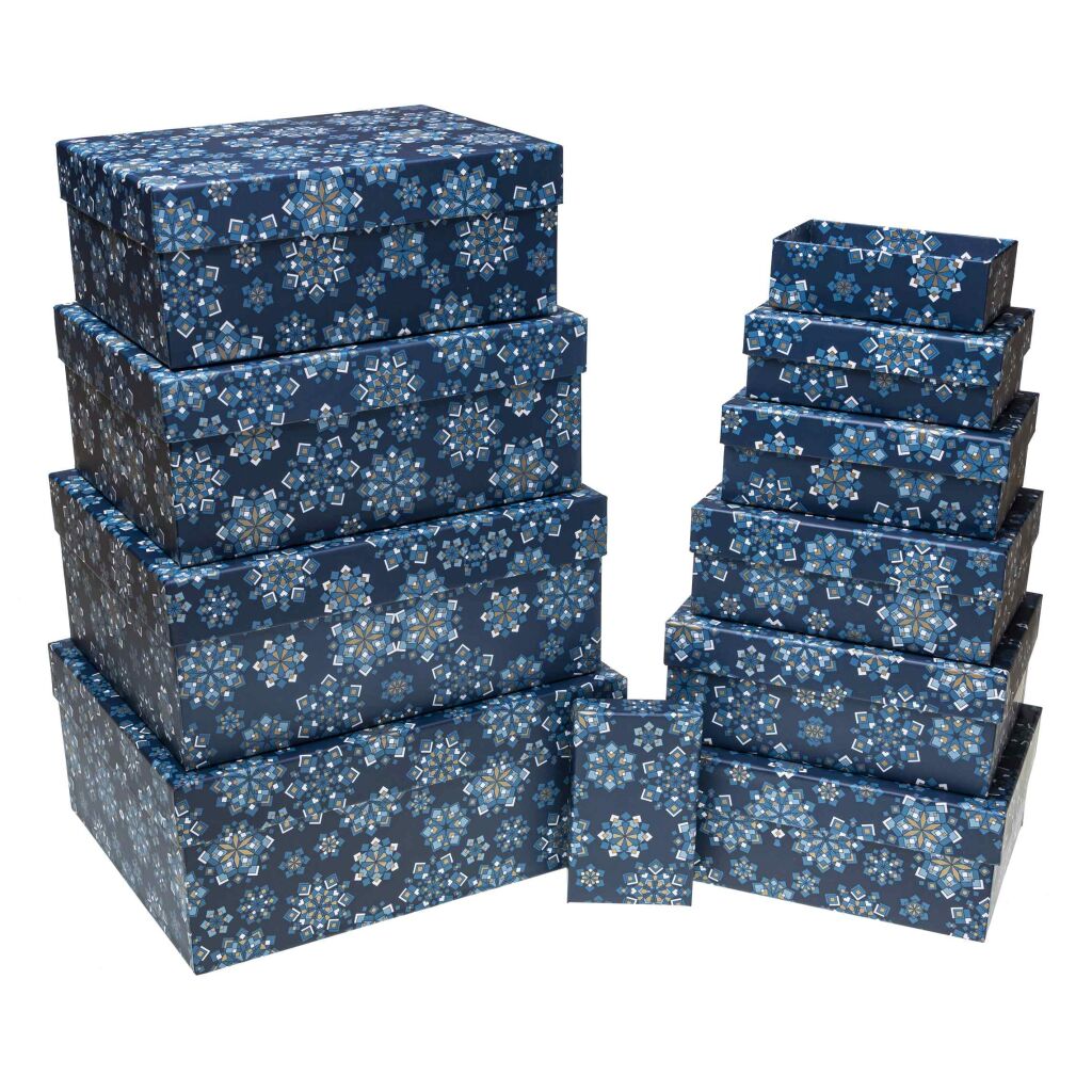 Sada dárkových krabic. Rozměry: 14,5 x 10 x 5 cm; 17 x 12 x 5,5 cm; 9 x 13,5 x 6 cm; 22 x 16 x 6,5 cm; 24,5 x 17,5 x 7 cm; 27,5 x 19,5 x 7,5 cm; ...
