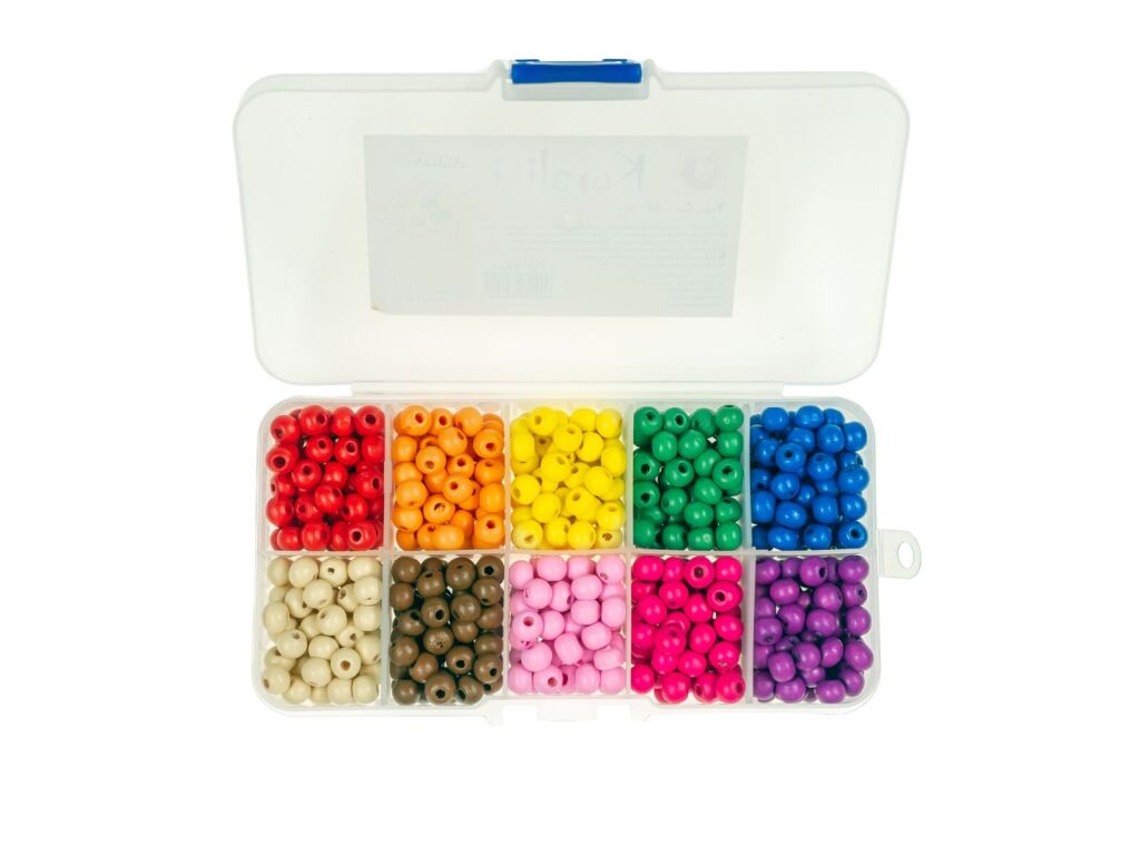 Dřevěné korálky k navlékaní, dekoraci a jiné tvůrčí činnosti. Korálky 6 mm, otvor 2,5 mm. 10 barev po 60 ks.