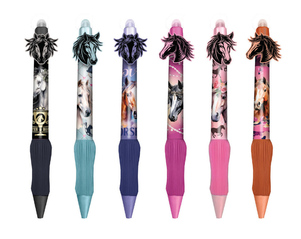 Gumovací pero Horses s gumovým úchopem. Tepelnou reakcí smazatelné, barva náplně: modrá.