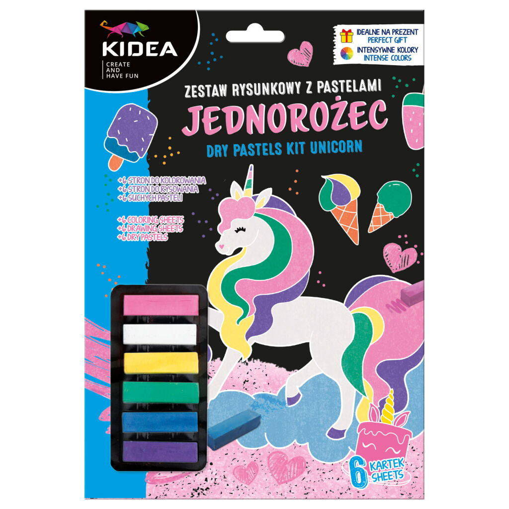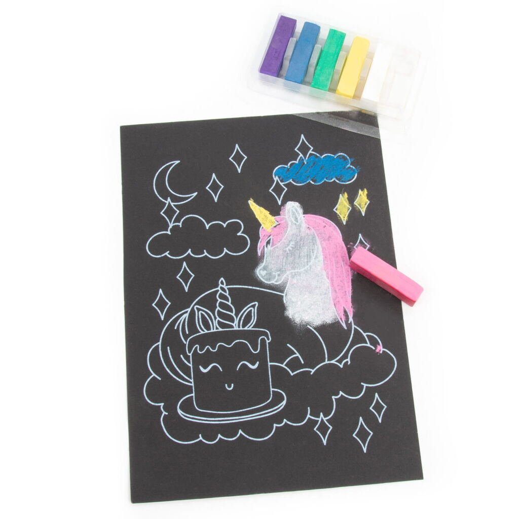 Suché pastele s šesti obrázky s předkresleným jednorožcem k vybarvení. Pastele jsou v šesti barvách: růžové, bílé, zelené, modré, fialové a žluté. Barvy krásně vyniknou na černém papíru. Pastele jsou snadno roztíratelné a můžeme tak snadno barvy mezi sebou míchat.