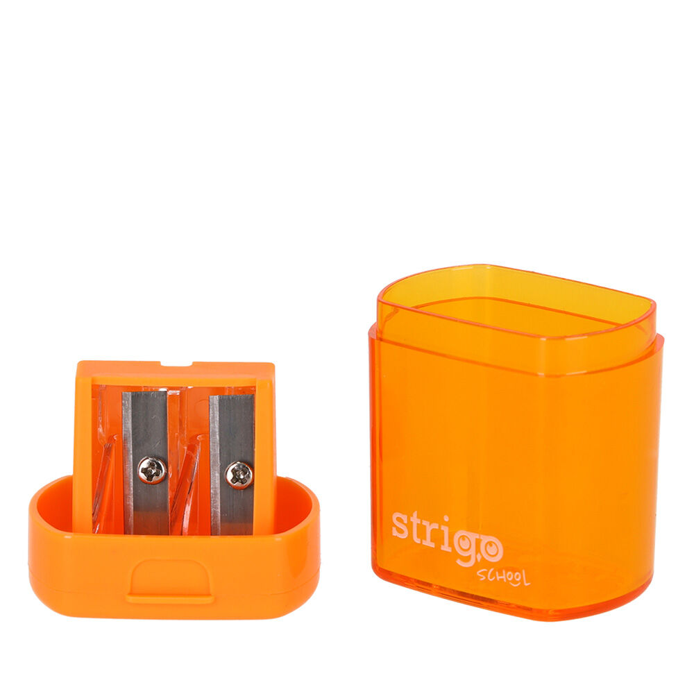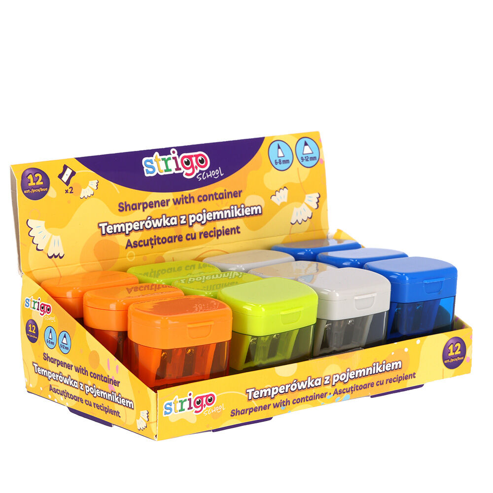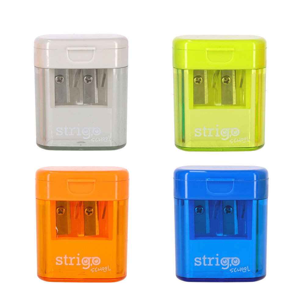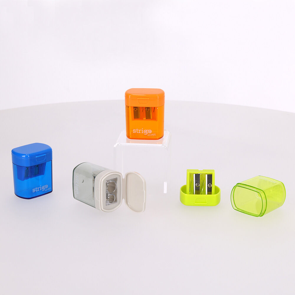 Ořezávátko s dvěmi otvory a plastovou nádobkou. V několika barevných provedeních.