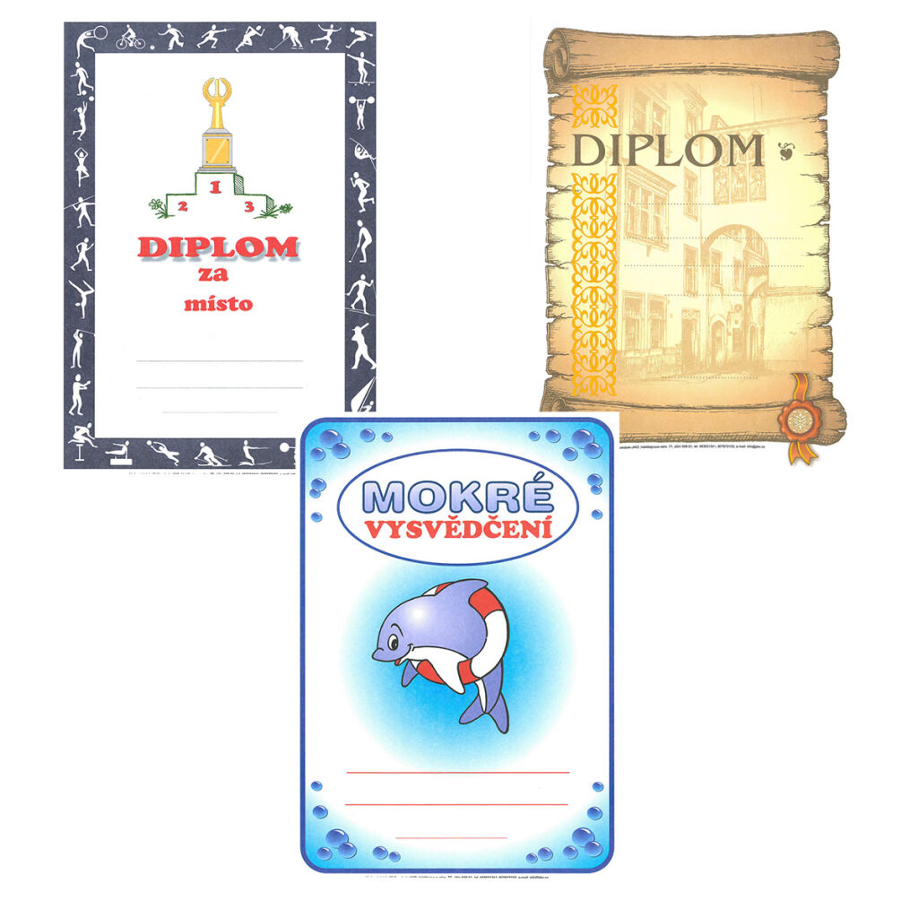 Papírový diplom A4, mix 3 motivů. Provedení: A4