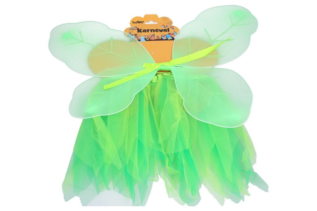 Karnevalový set ve 2 barevných provedeních (zelený, růžový). Obsahuje: sukni a, křídla. Sukně o délce 28 cm.