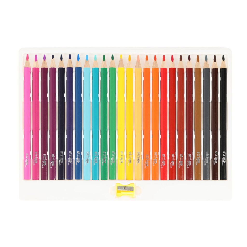 24 JUMBO pastelek vyrobených z měkkého lipového dřeva. Vnitřní grafit má tloušťku 3,0 mm. Ořezávátko je součásti balení.