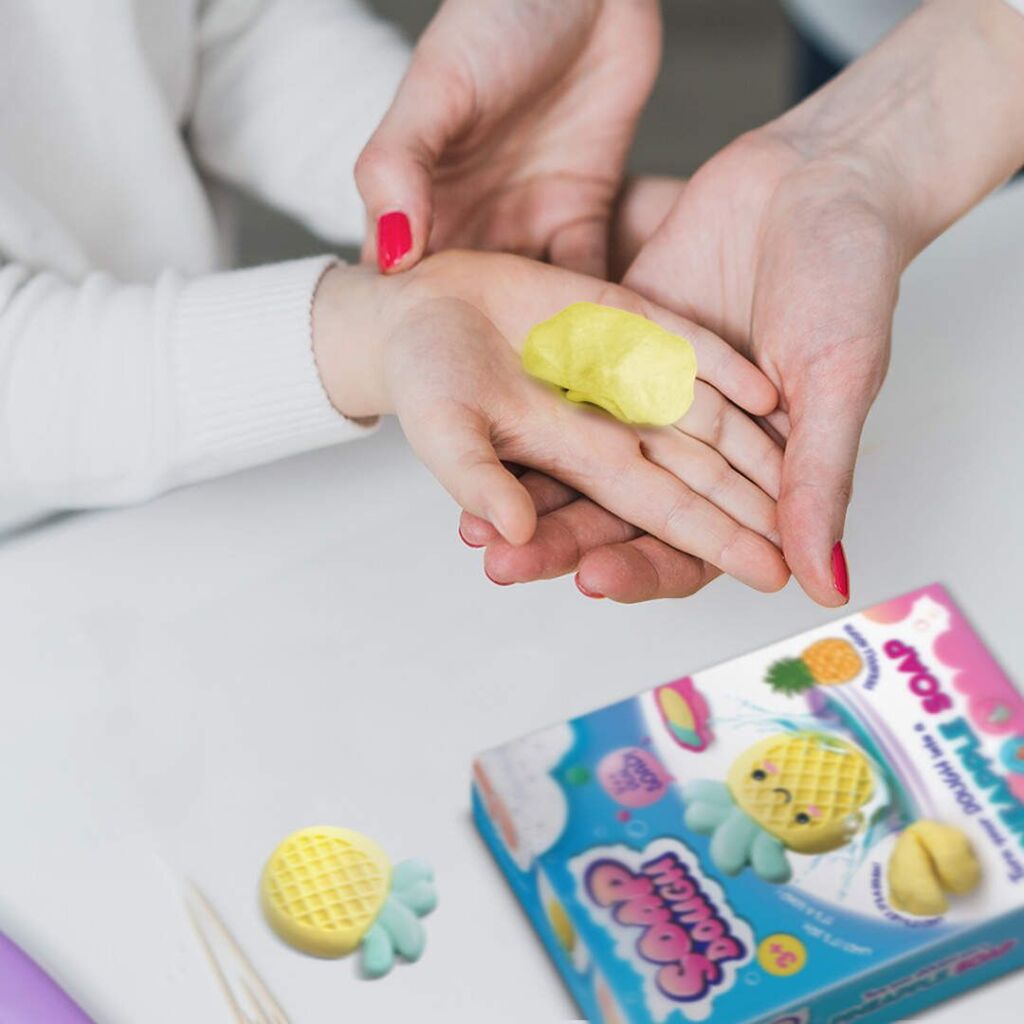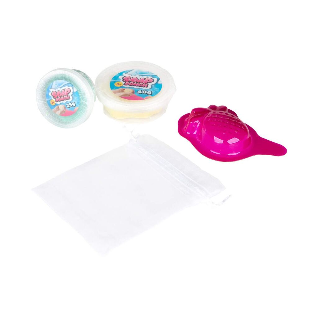 Netoxická sada pro výrobu vlastního mýdla. Obrázkový návod součástí balení. Sada obsahuje: mýdlovou hmotu s ovocnou vůní formičku síťovaný pytlík návod