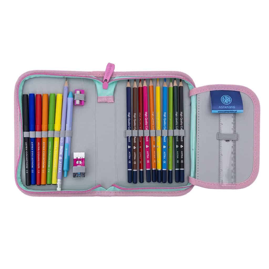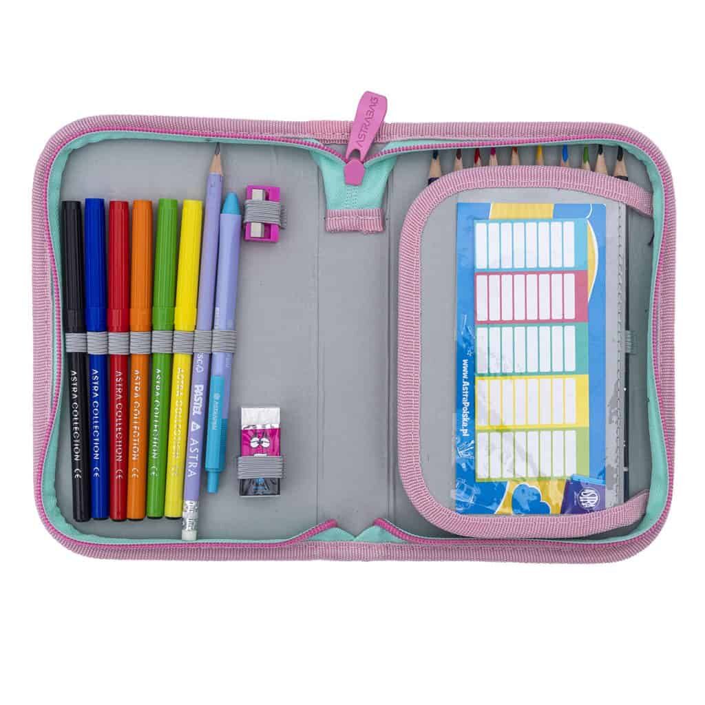 Výbavený penál s jednou klopou. Obsahuje: pastelky 10 ks, fixy 6 ks, propiska, tužka s gumou, ořezávátko, pryž, rozvrh hodin, pravítko.