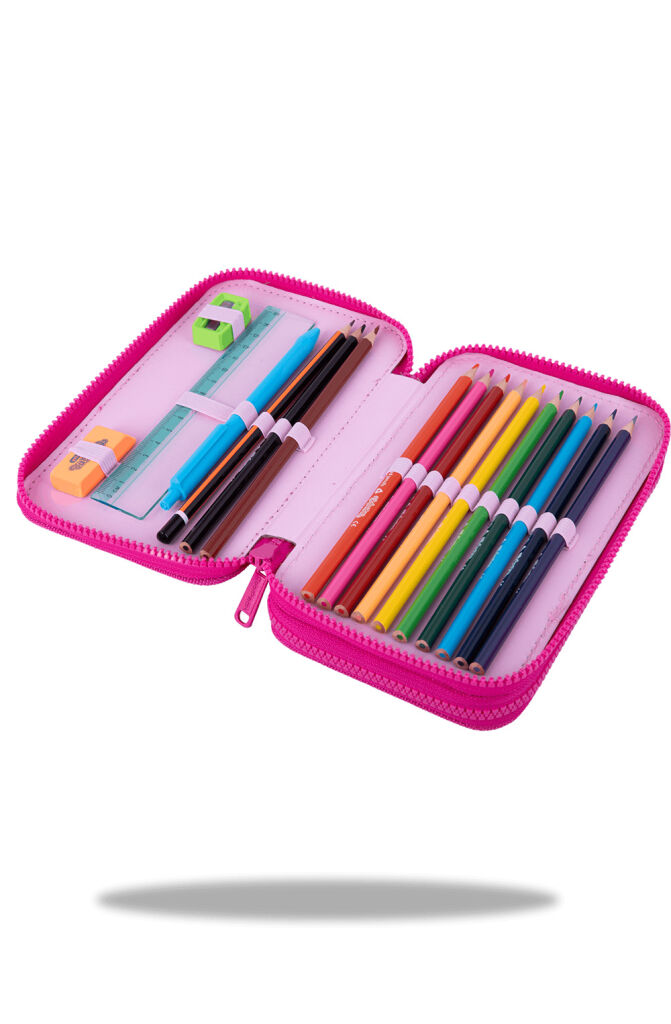 Vybavený 2 zipý školní penál CoolPack Jumper 2 Obsahuje: • trojhranné pastelky Colorino 12 ks • barevné fixy Colorino 18 ks • trojhranná tužka HB Colorino 1 ks • kuličkové pero Patio Base 1 ks • pravítko 15 cm • pryž Colorino • ořezávátko