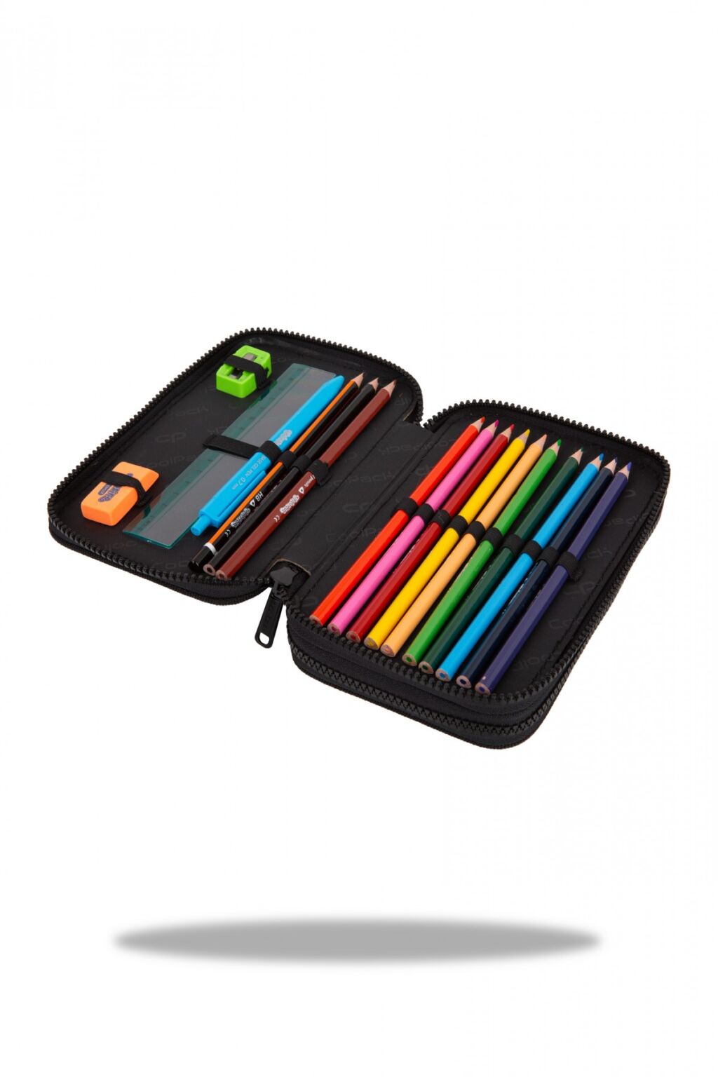 Vybavený 2 zipý školní penál CoolPack Jumper 2 Obsahuje: • trojhranné pastelky Colorino 12 ks • barevné fixy Colorino 18 ks • trojhranná tužka HB Colorino 1 ks • kuličkové pero Patio Base 1 ks • pravítko 15 cm • pryž Colorino • ořezávátko