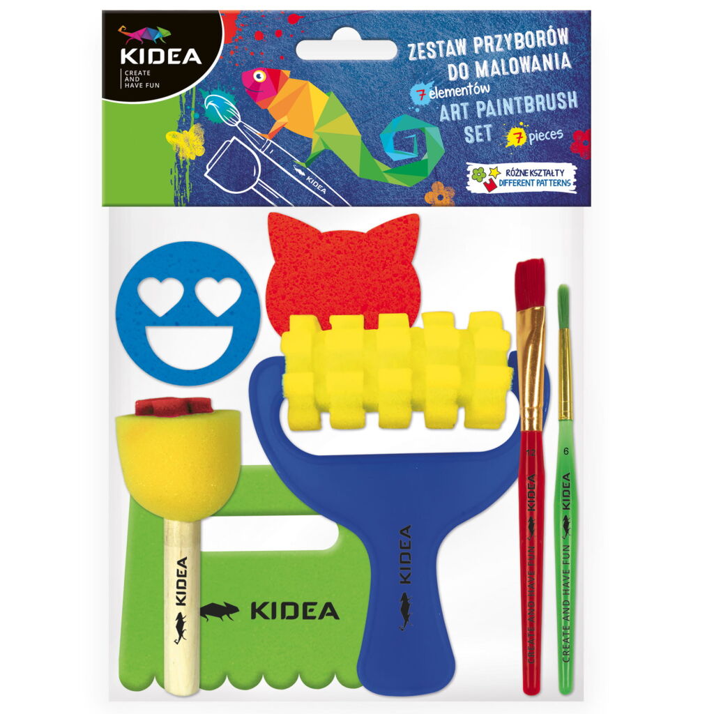 Sada obsahuje: dva štětce, váleček, špachtle, razítko kytičku s dřevěnou rukojetí a dvě houbičková razítka ve tvaru smajlíka a kočičky.