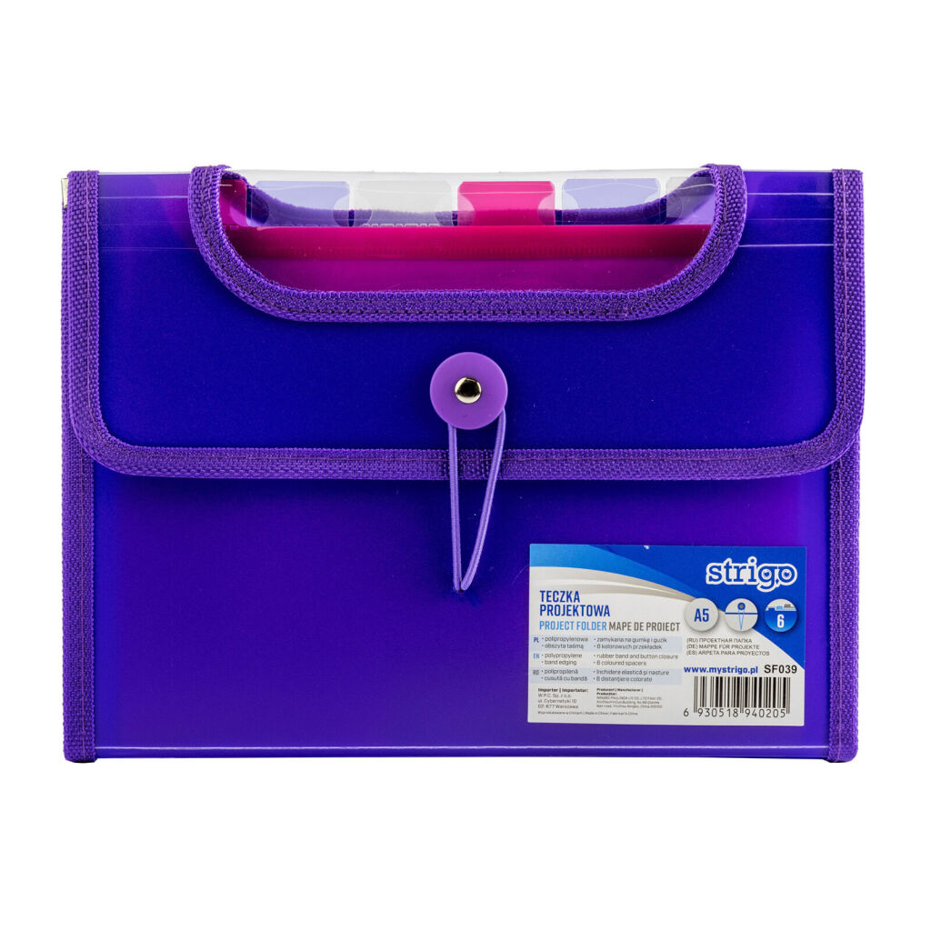 Fialová složka A5 s 6 kapsami / přehrádkami se zapínáním na gumu a knoflík.