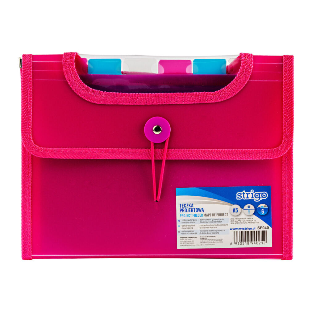 Růžová složka A5 s 6 kapsami / přehrádkami se zapínáním na gumu a knoflík.