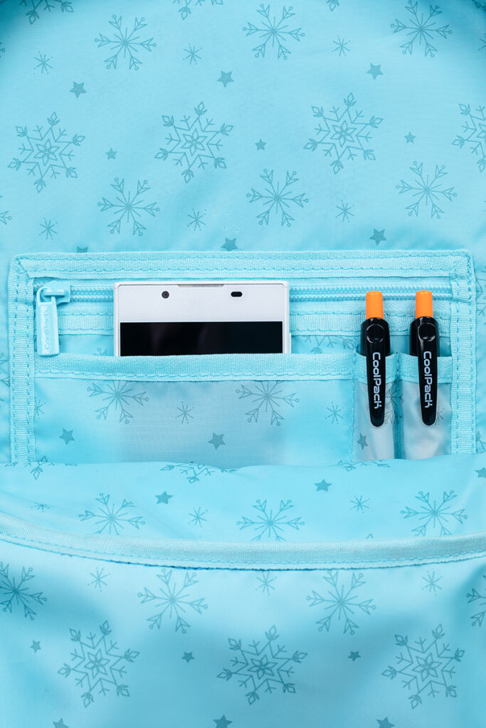 • uvnitř kapsa s organizérem - přihrádka se síťovinou se zapínáním na zip, místo na psací potřeby a otevřená kapsa;