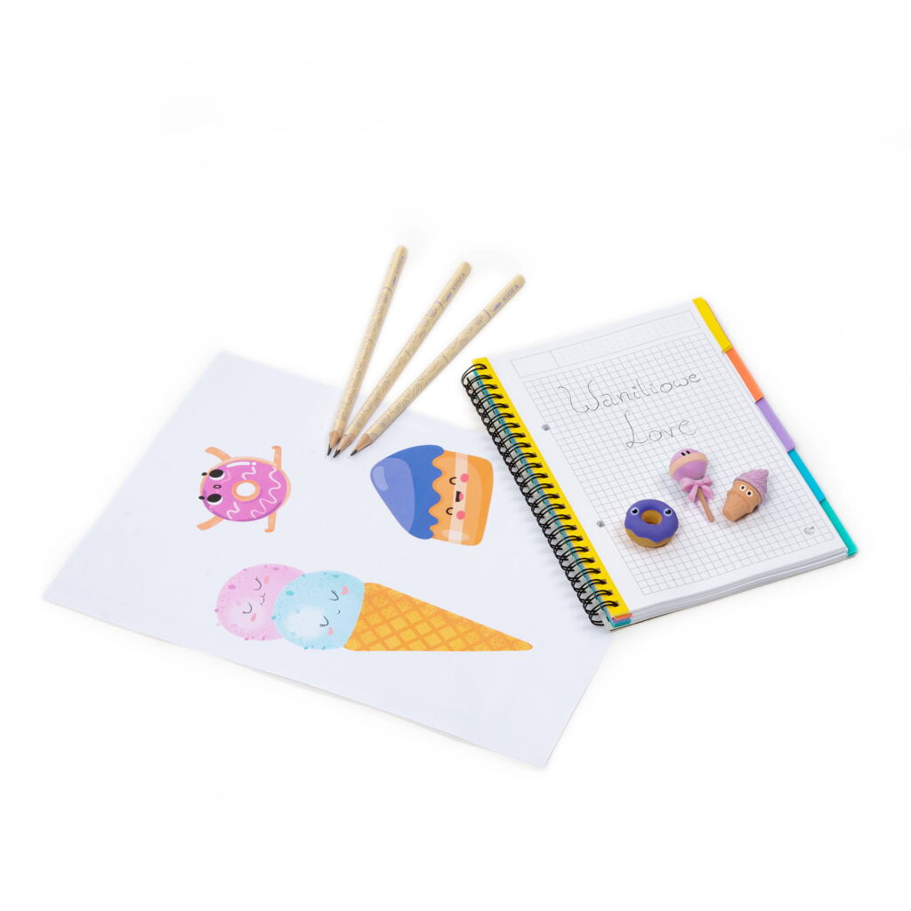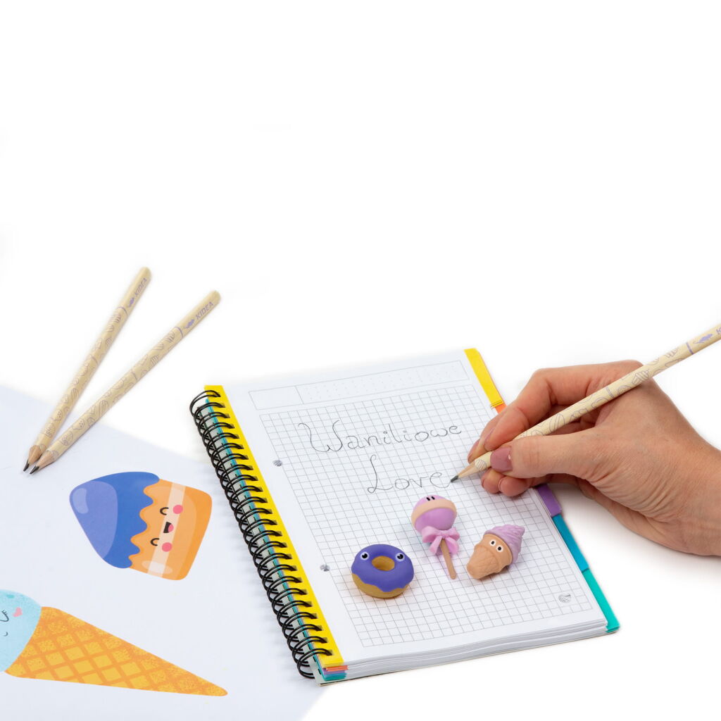 3 ks tužek a 3 ks pryží s vůní vanilky na blistru. Pryž ve tvaru zmrzliny, muffina a donuta.