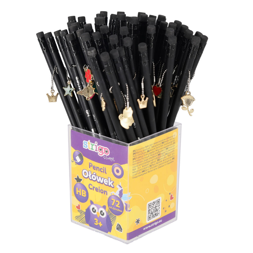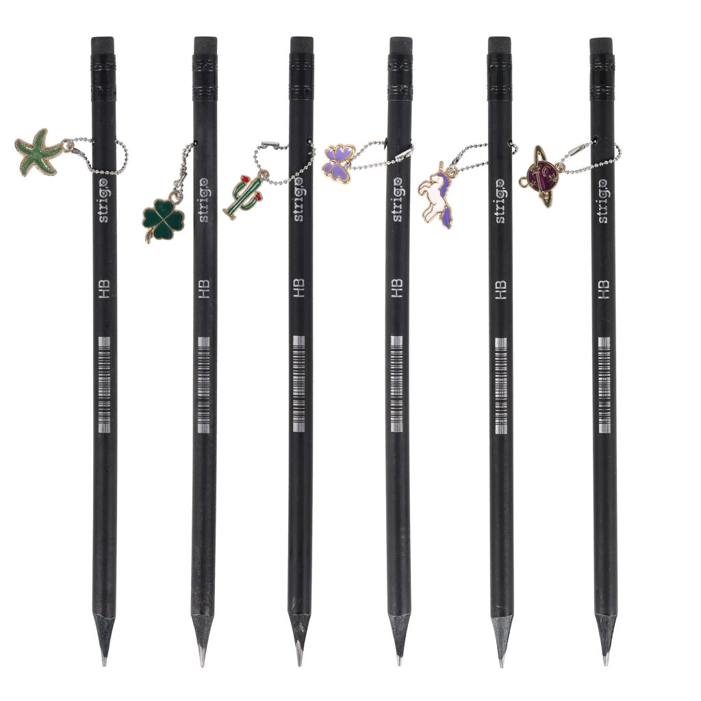 Kulatá tužka s gumou Strigo z černého dřeva s dekoračním přívěskem.