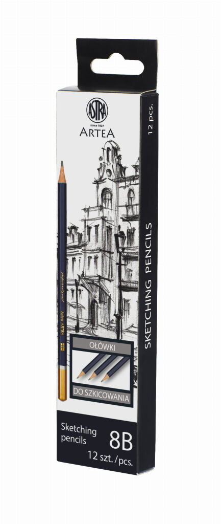 Umělecká skicovací šestihranná tužka ASTRA ARTEA o tvrdosti 8B. Ekologicky nezávadný lak na vodní bázi s certifikátem FSC. Tužky ASTRA ARTEA extra odolné proti lámání díky SV lepení. Balení obsahuje 12 ks.