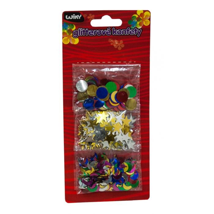 Metalické konfety ve tvaru půlměsíce, hvězdy a kolečka.